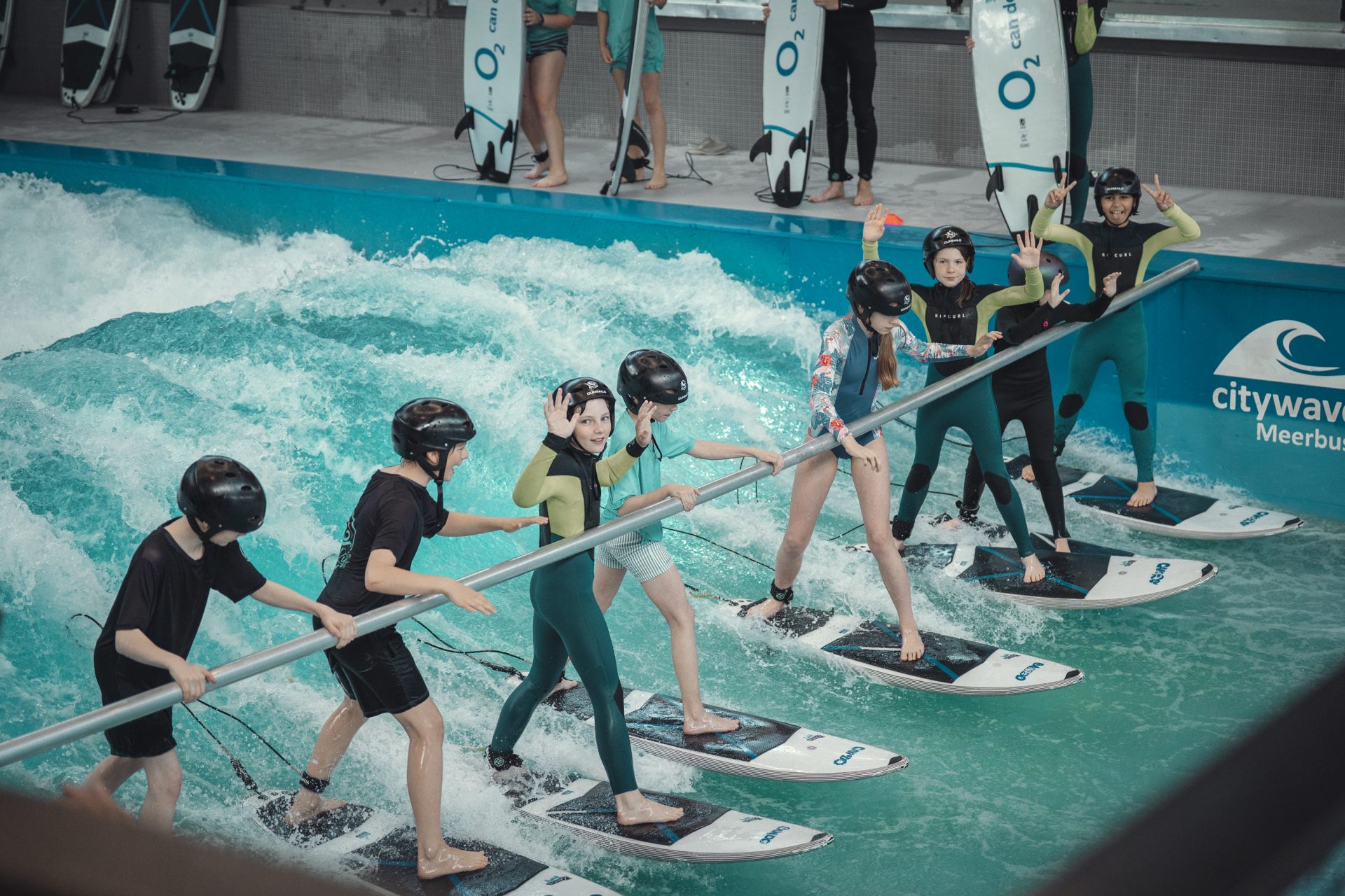 Gemeinsam mit einem erfahrenen Surfcoach lernen die Kids spielerisch das Wellenreiten – sicher, geführt und mit jeder Menge Spaß!